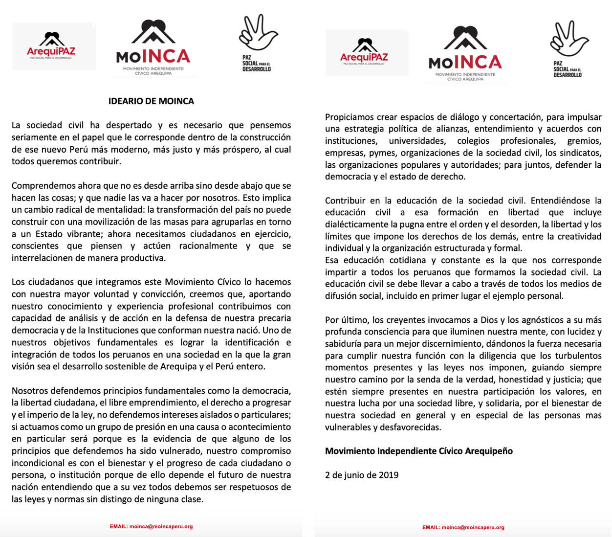 MOINCA es un movimiento cívico de ciudadanos, que nace para dar voz a una mayoría silenciosa, crear espacios de diálogo y concertación para el desarrollo sostenible, la cultura y el crecimiento de la economía de Arequipa.