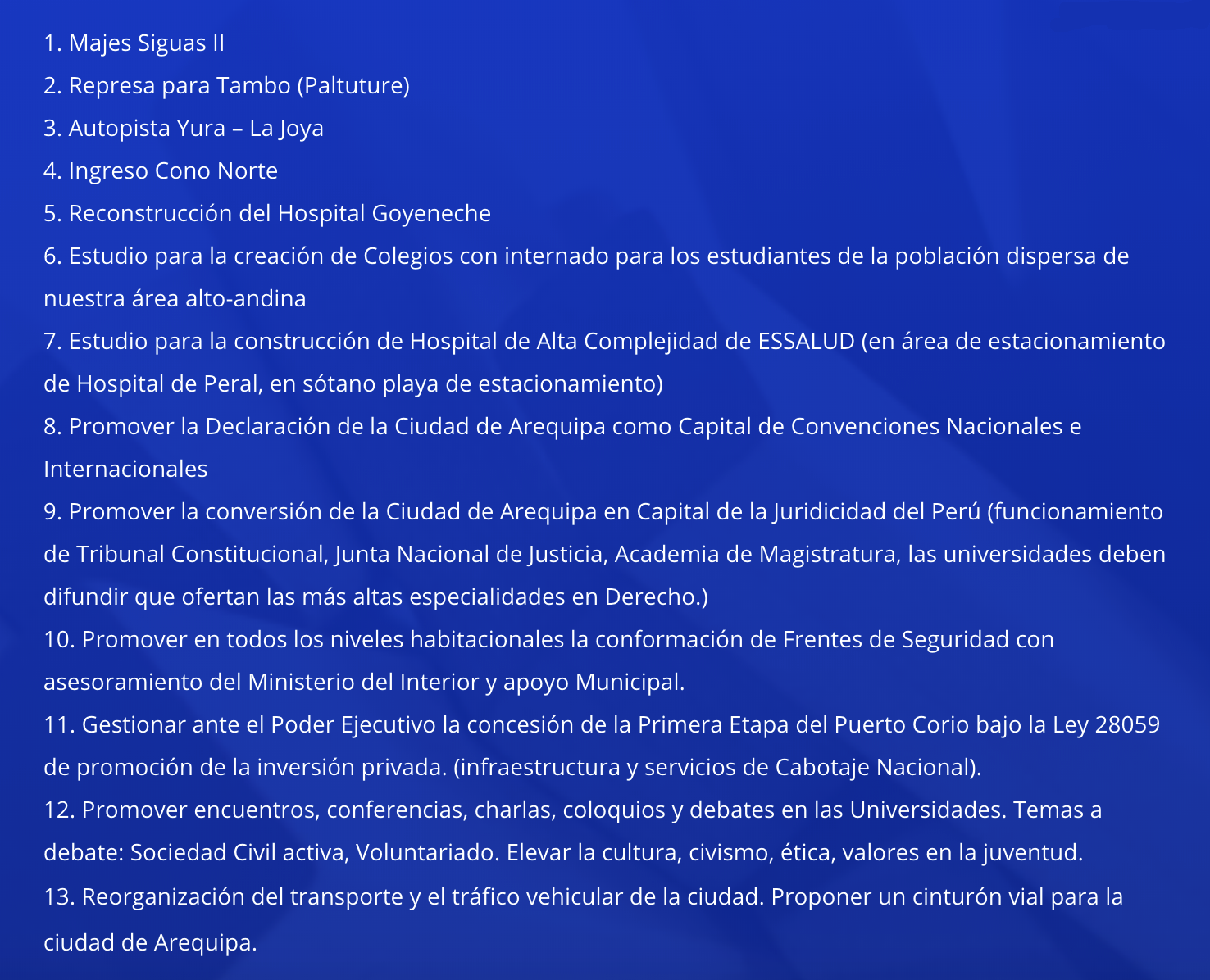 Los ciudadanos que integramos este Movimiento Cívico lo hacemos con nuestra mayor voluntad y convicción, creemos que, aportando nuestro conocimiento y experiencia profesional contribuimos con capacidad de análisis y de acción en la defensa de nuestra precaria democracia y de la Instituciones que conforman nuestra nación. Uno de nuestros objetivos fundamentales es lograr la identificación e integración de todos los peruanos en una sociedad en la que la gran visión sea el desarrollo sostenible de Arequipa y el Perú entero.
